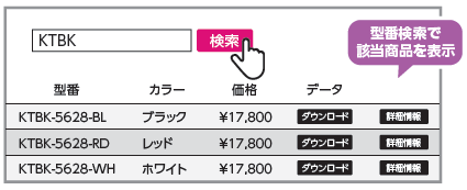 どれだけ膨大な商品数があったとしても、閲覧ユーザーは、型番や品名で検索するだけで該当する商品情報をすぐに見ることができます。商品に関連するデータのダウンロードや、購入サイトへの誘導など、掲載する内容はお客様自身で追加・編集が可能です。