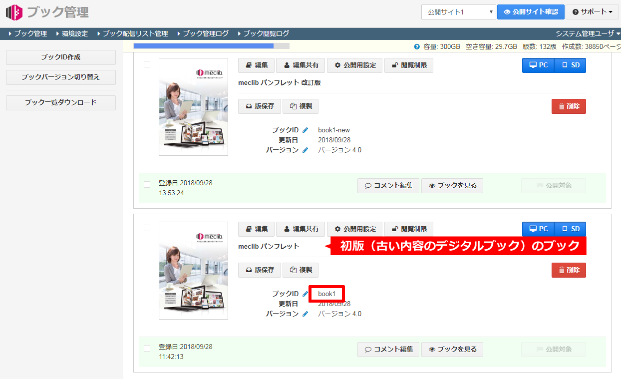 第二版(新しい内容のデジタルブック)のブックIDを”ブックID変更”から公開中のブックID「book1」に変更します。