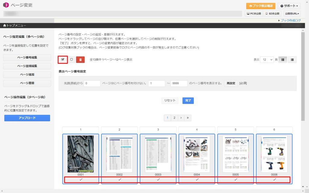 デジタルブック登録後に掲載の順番を訂正するなどで、少数のページが対象になる場合は、ドラッグ&ドロップによるページ入れ替えをご利用ください。